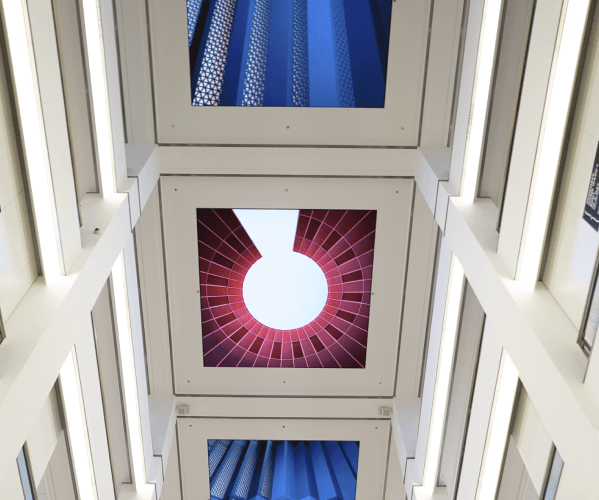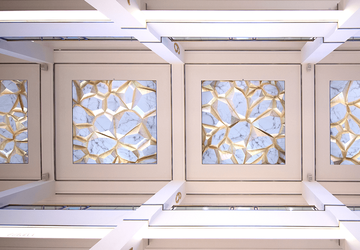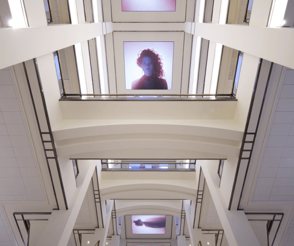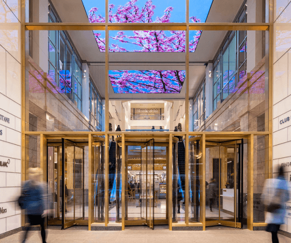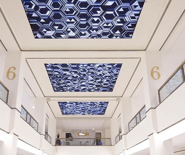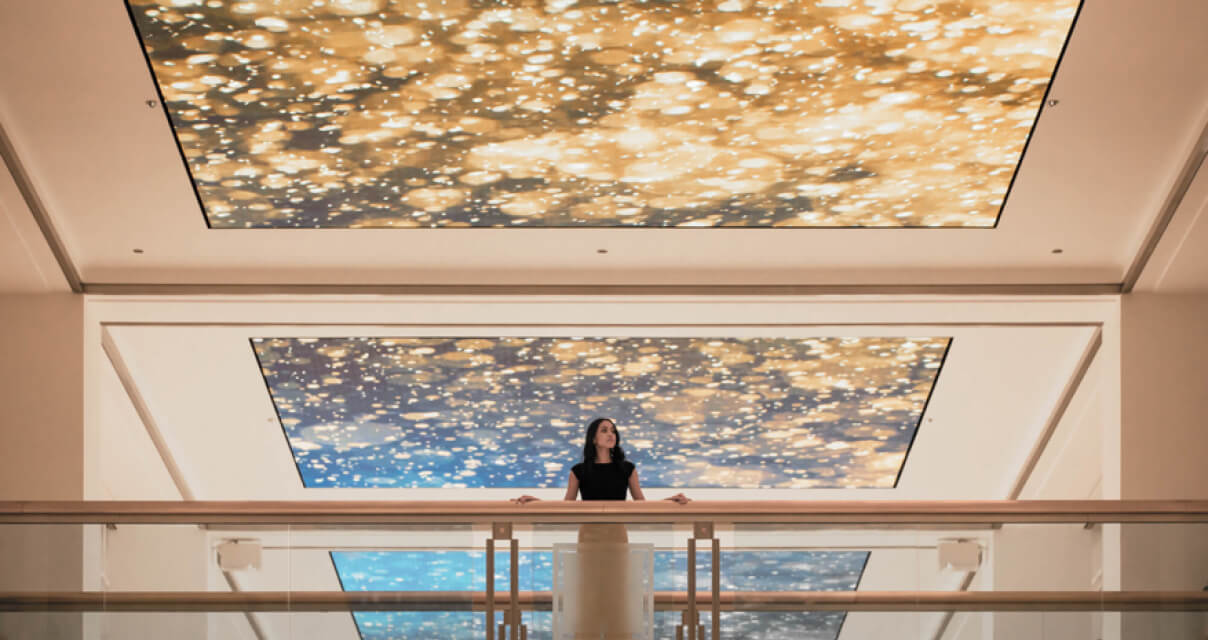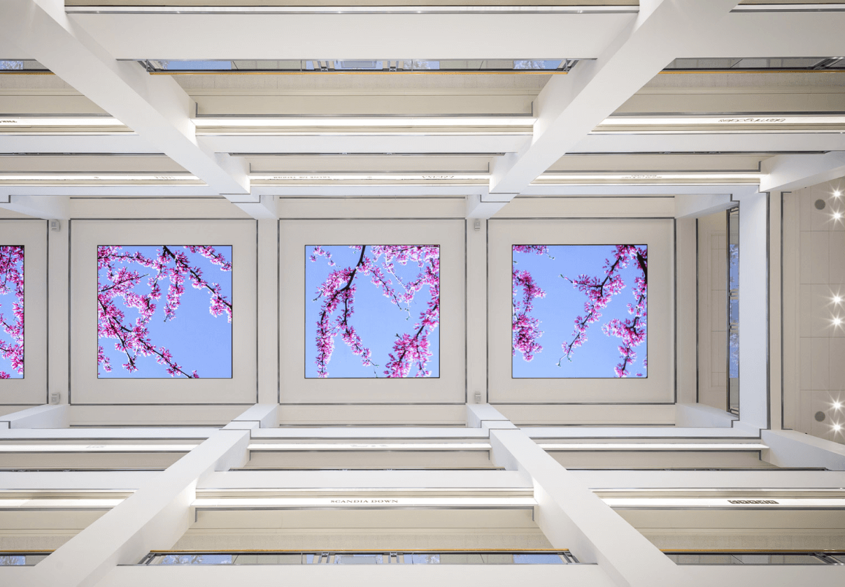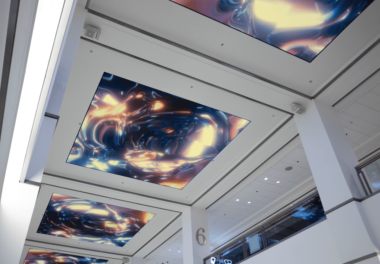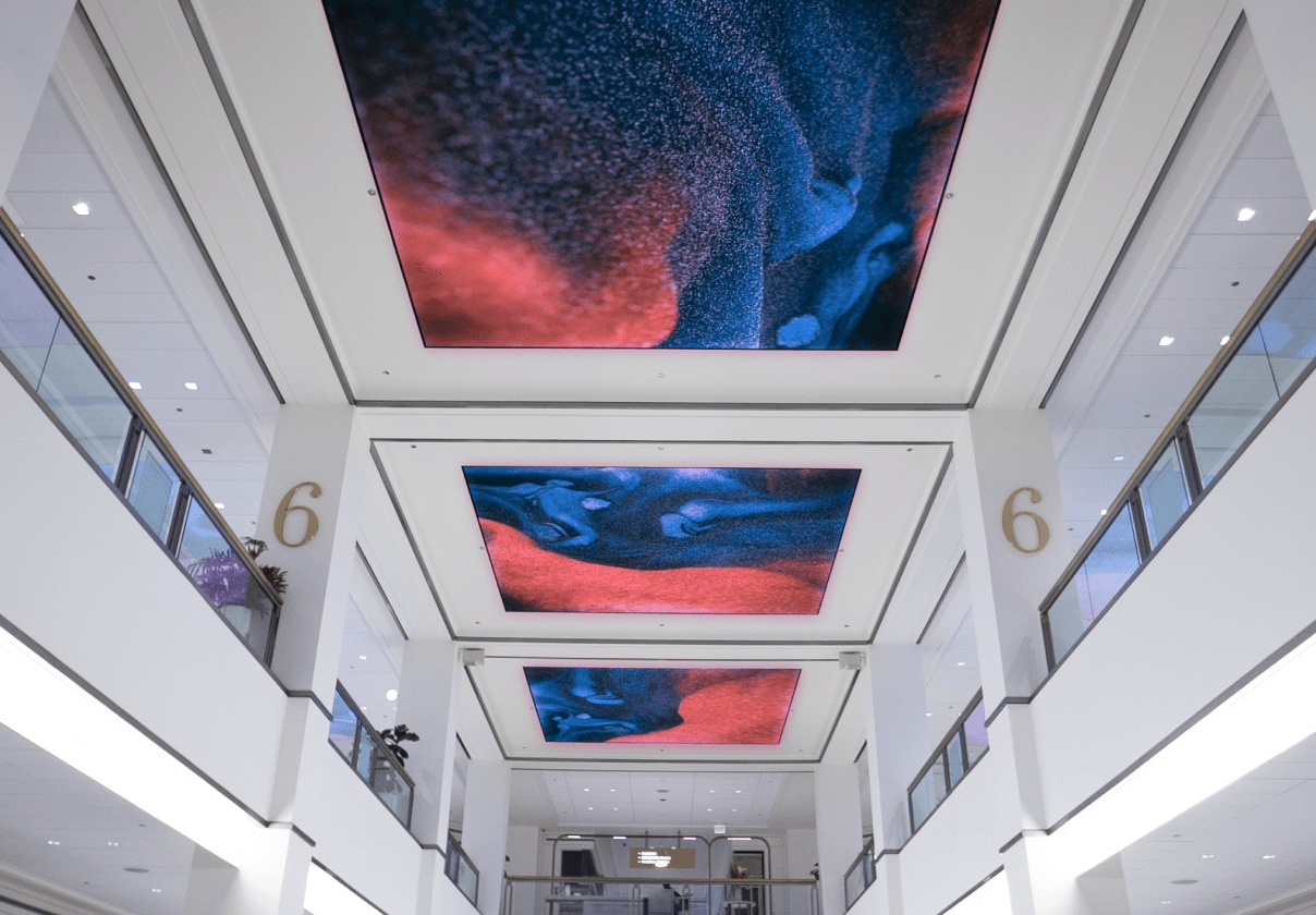 A 190-foot LED digital art installation that mimics a giant skylight, fully enveloping the visitors’ shopping experience with artful stories that unfold over time.